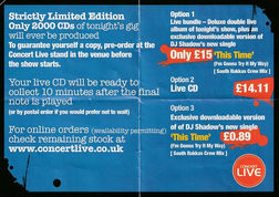 Double sided flyer to promote the US release of the Deluxe Edition of Endtroducing. Note that the front of this flyer is also a sticker, with the front being removable.